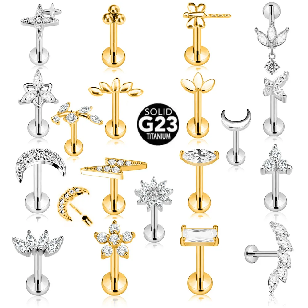 ASTM F136 G23 티타늄 플라워 문 나비 나사없는 피어싱 라이트닝 핀 푸시 인 립 스터드 Daith Conch 귀걸이 16G 18G 20G