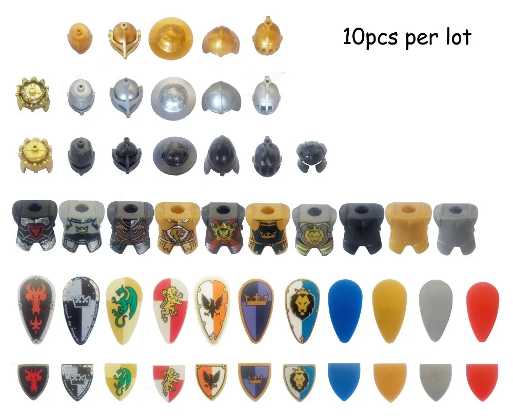 캐슬 나이트 프린트 갑옷 방패 조끼, 무기 크라운, 킹 드래곤 모자, 충돌 헬멧, 빌딩 블록, 벽돌 입자