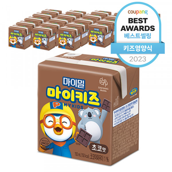 대상 웰라이프에서 나온 마이밀 마이키즈 초코맛 입니다! 실제로 일반 초코 우유와 다른 독특한 맛과... ㅎ 150ml24개가 들어가 있습니다. 뽀롱뽀롱 뽀로로 덕분에 아이들이 부담없이 잘 먹을 수 있습니다.ㅋ...