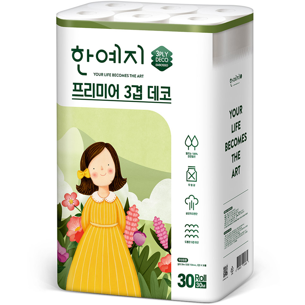 한예지 프리미어 3겹데코 천연펄프 롤화장지 30 m, 30롤, 1팩 구경하러가기