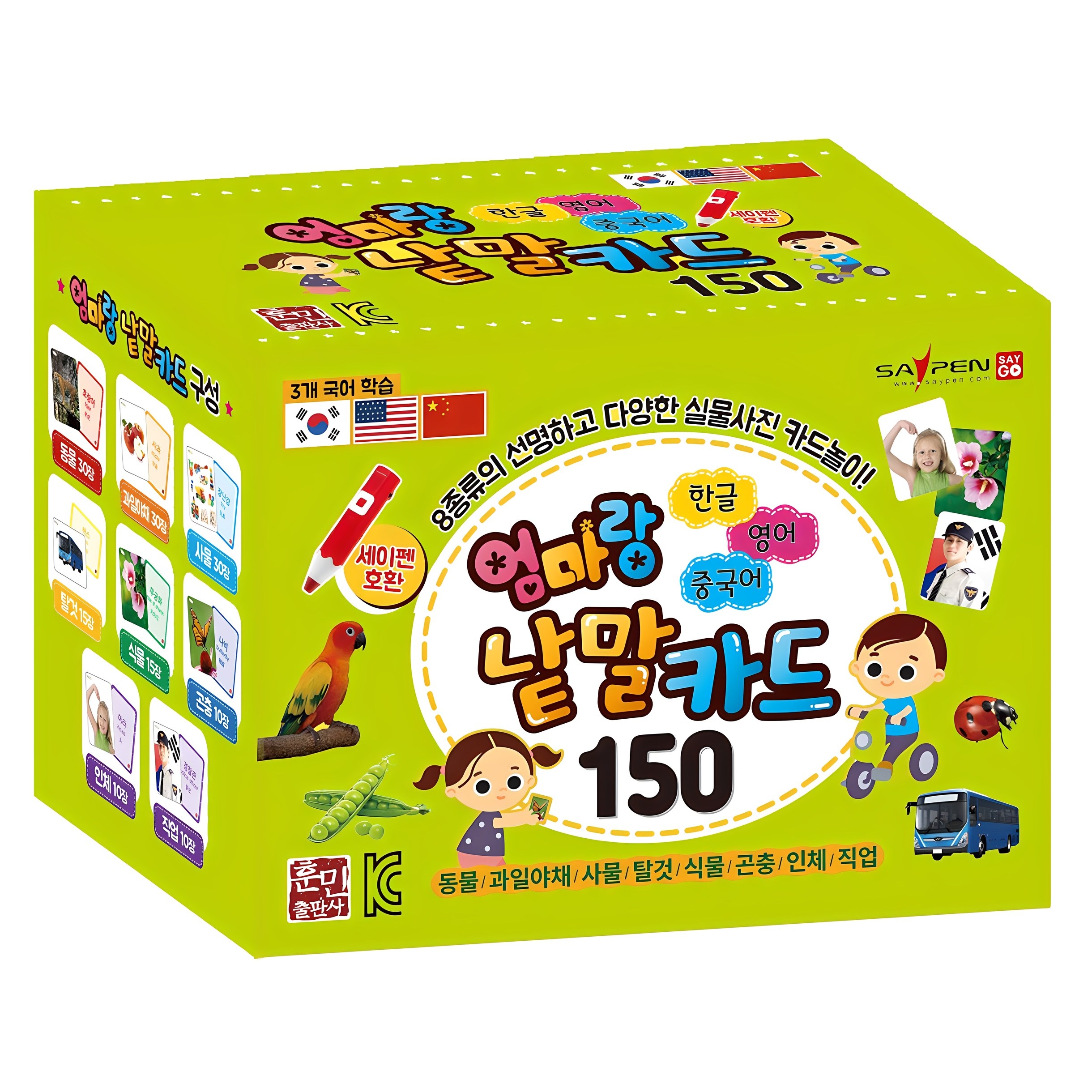 구입한건 엄마랑 낱말카드 훈민출판사 단어카드입니다 세이펜이랑 호환되는 낱말카드이고요 기본은 150장이고 업그레이드하면 210장짜리가있어요 기본 동물/과일, 야채/탈것/식물/ 사물/곤충/인체/직업에...