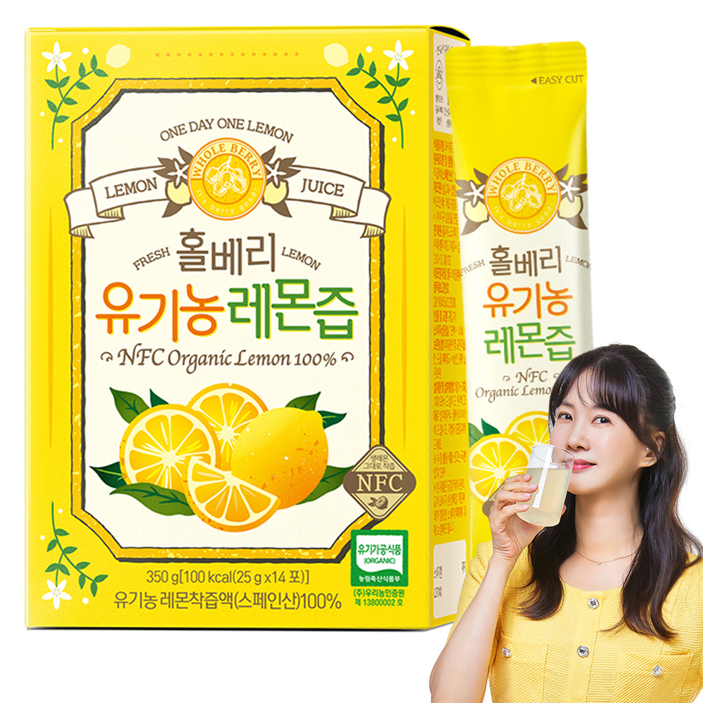 제품명 : 홀베리 레몬즙 제품유형 : 과·채주스 원재료명 및 함량 : 유기농 레몬 착즙액 (스페인산) 100% 섭취량 및 방법 : 1일 1~3회, 1회 1포씩, 원액 또는 물/탄산수 등에 희석 섭취 내용량 : 총 내용량 350g 열량...